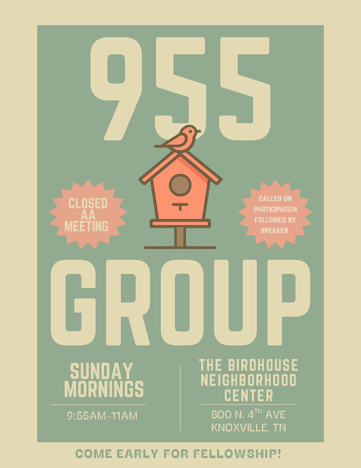 The 955 Group meets Sunday mornings from 9:55 AM to 11:00 AM at The Birdhouse Neighborhood Center, 800 N. 4th Ave., Knoxville, TN.