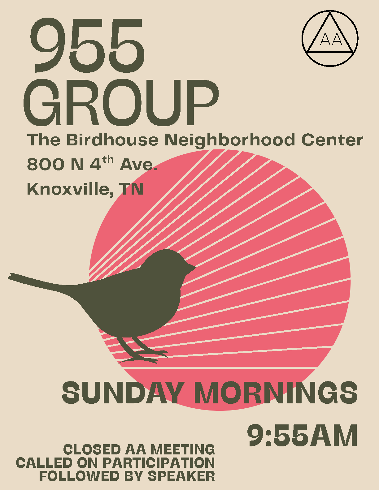 NEW MEETING – The 955 Group. Closed AA meeting Sundays at 9:55 AM in Knoxville.