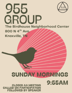 The 955 Group meets Sunday mornings from 9:55 AM to 11:00 AM at The Birdhouse Neighborhood Center, 800 N. 4th Ave., Knoxville, TN.
