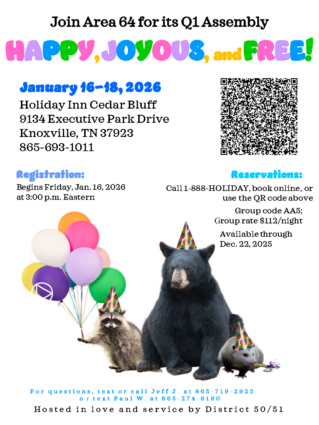 Area 64 will hold its Q1 Assembly on January 16–18, 2026, at the Holiday Inn Cedar Bluff in Knoxville, TN. Registration begins Friday at 3:00 PM Eastern. Click for more details.