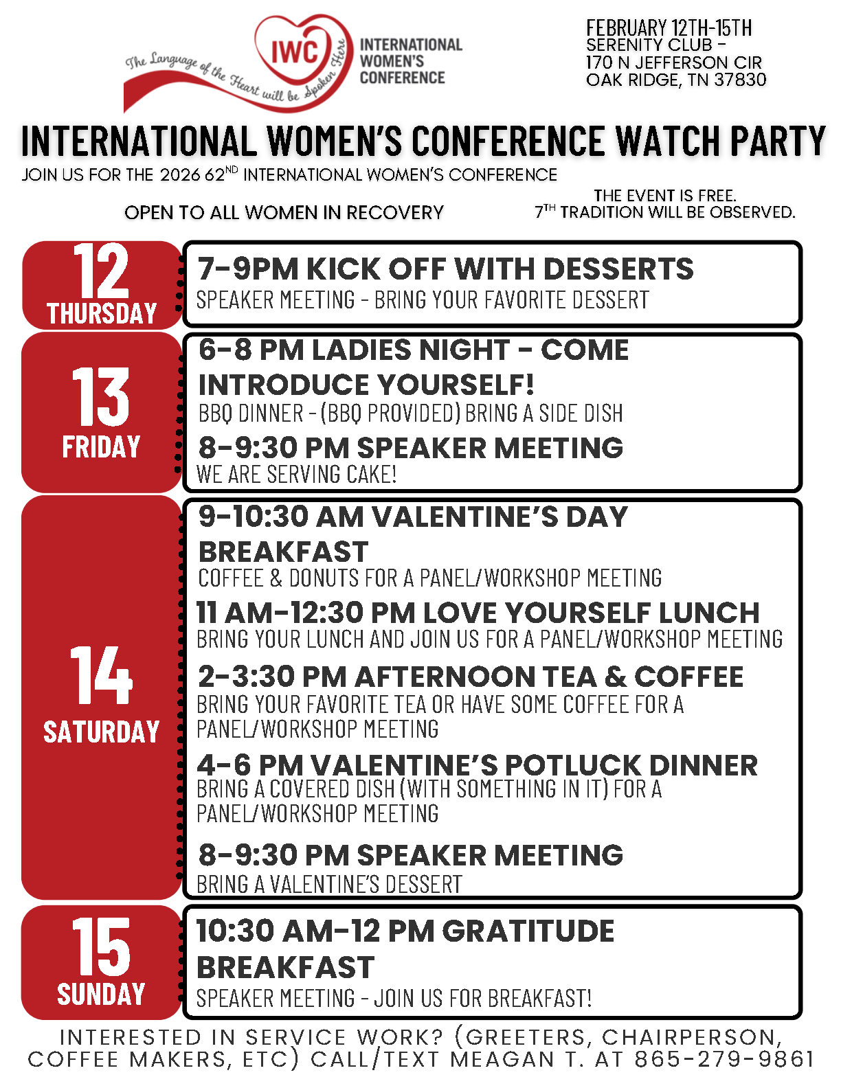 The 62nd International Women’s Conference will be held February 12–15, 2026, at the Hilton Des Moines Downtown. This is a closed conference for AA women registrants only, offering connection and fellowship in recovery. Registration is $20 online or $65 in person—Click for more details.