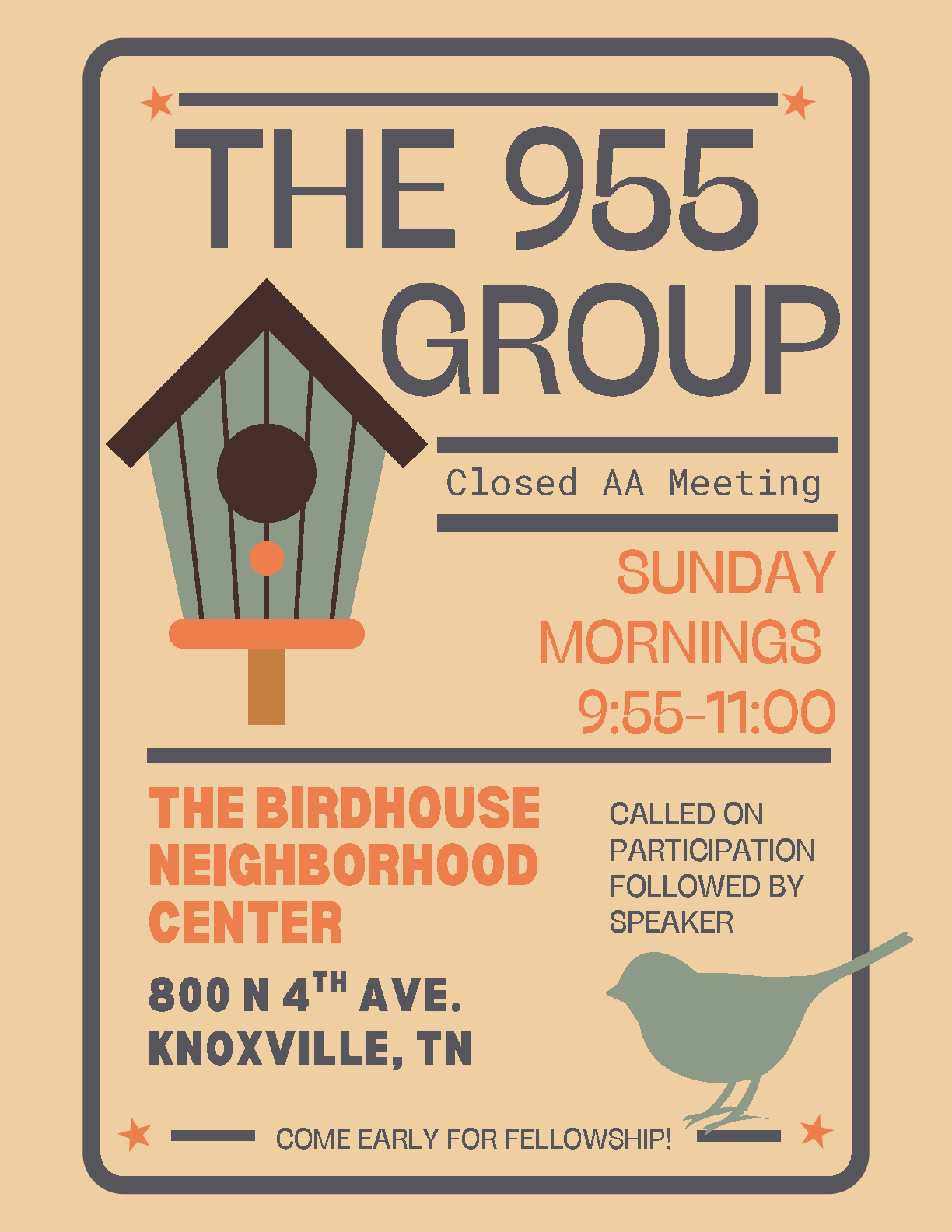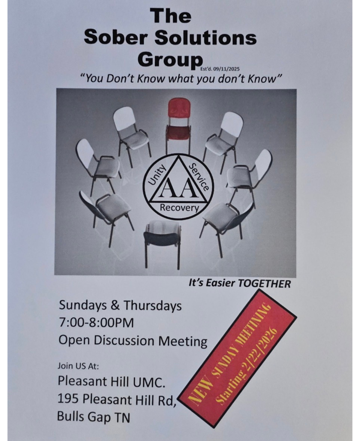 NEW MEETING – The 955 Group. Closed AA meeting Sundays at 9:55 AM in Knoxville.