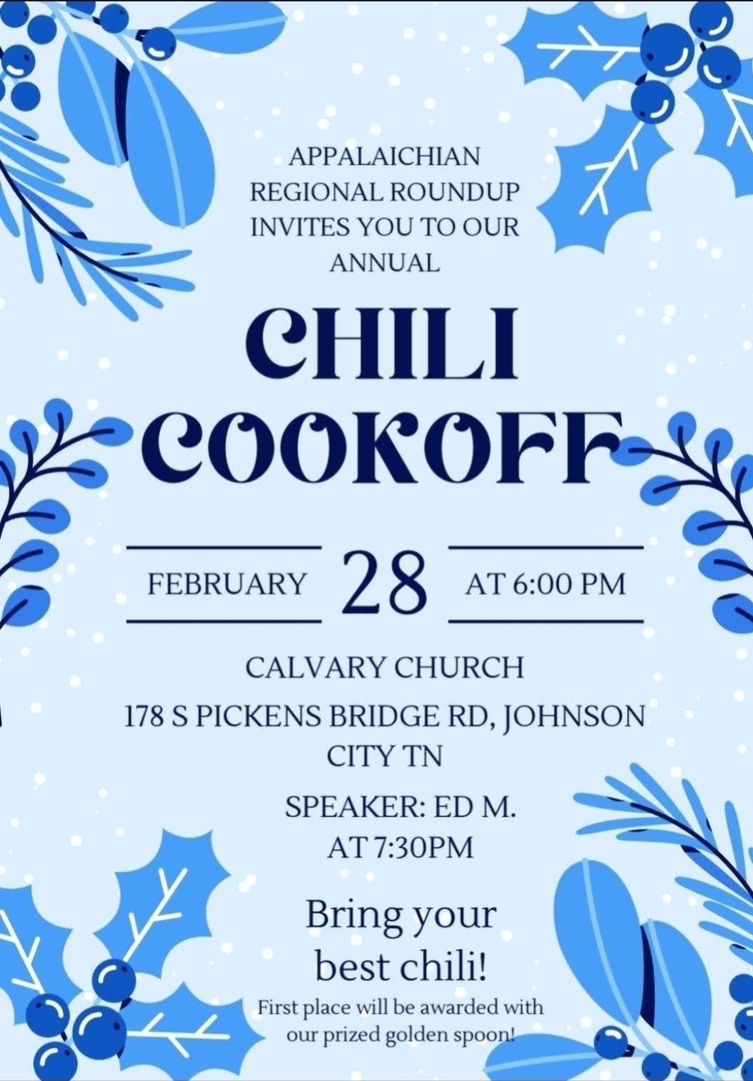 Appalachian Regional Roundup Chili Cookoff – Feb 28 at 6 PM in Johnson City. Speaker at 7:30 PM.