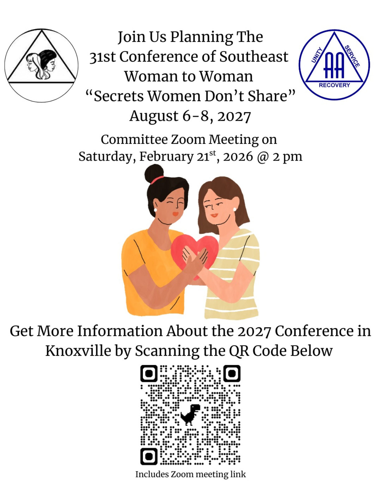 Planning committee Zoom meeting for the 31st Southeast Woman to Woman Conference. Open to women in recovery interested in service.