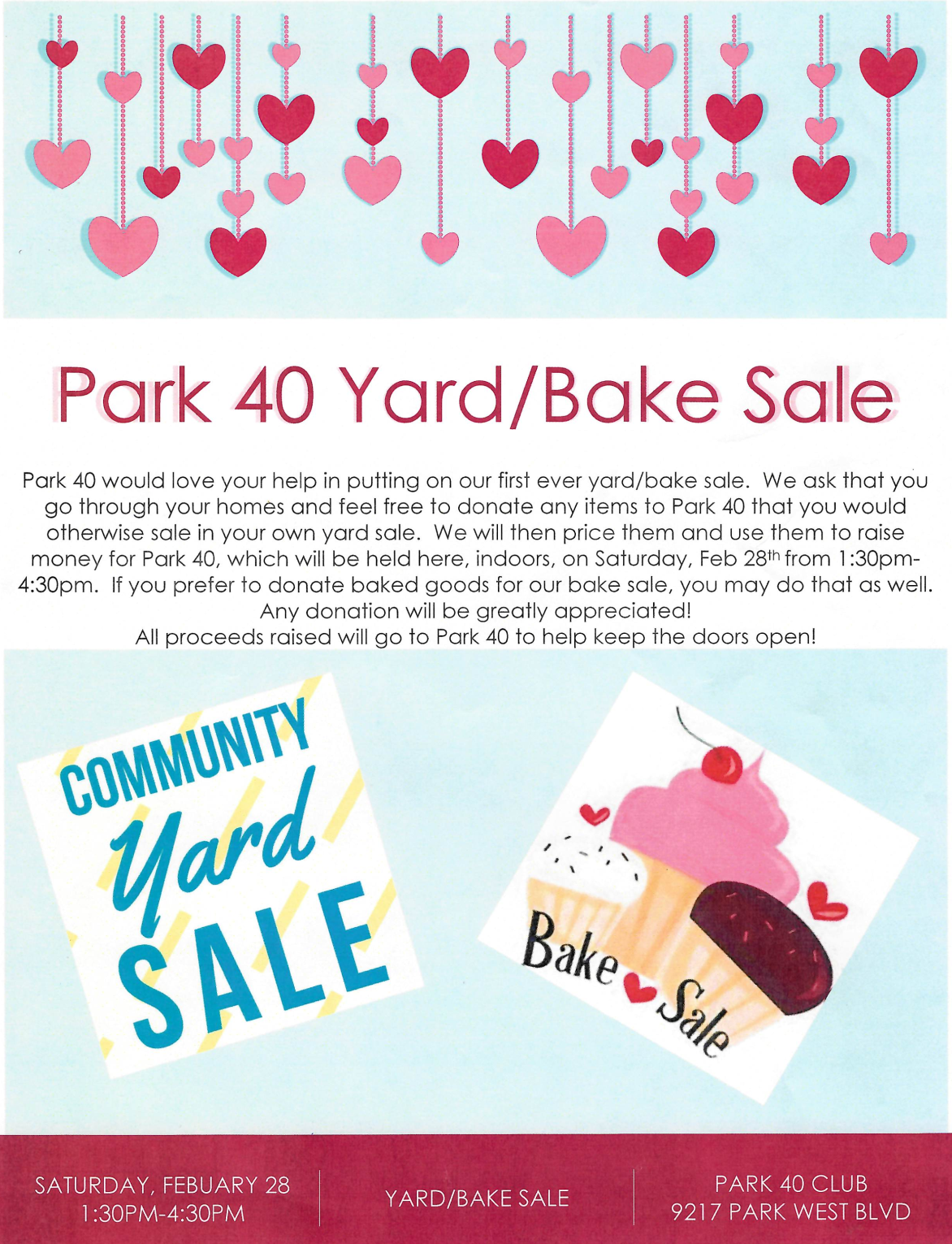 Community yard and bake sale benefiting Park 40. All proceeds help support Park 40 and keep the doors open.