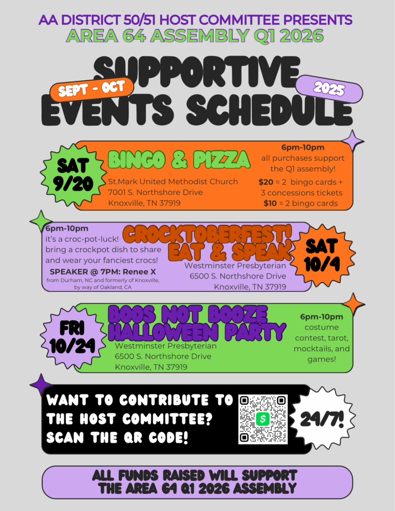Get ready for an exciting lineup of sober social events this fall! The AA District 50/51 Host Committee has planned three fantastic fundraising events to support the upcoming Area 64 Q1 2026 Assembly in Knoxville this January.