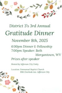 Join us for District 3ās 3rd Annual Gratitude Dinner on Saturday, November 8, 2025, at Emmanuel Baptist Church in Jefferson City. Dinner begins at 6 PM, followed by guest speaker Beth from Morgantown, WV at 7 PM, plus prizes after the talk. A night of fellowship, gratitude, and inspiration awaitsāClick for more details.