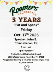 Celebrate ROAMERSā 5th Anniversary with an Eat and Speak on Friday, October 17, 2025, at Trinity United Methodist in Knoxville. Dinner at 6 PM (bring a dish to share) followed by guest speaker John E. from Lebanon, TN at 7 PM.