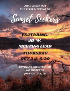 Join us for the very first Sunset Seekers meeting in Johnson City on Thursday, October 2 at 6:30 PM at Covenant Presbyterian. Featuring meeting lead JD W., this new group invites all to connect and grow in fellowship.