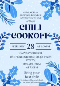 Appalachian Regional Roundup Chili Cookoff – Feb 28 at 6 PM in Johnson City. Speaker at 7:30 PM.