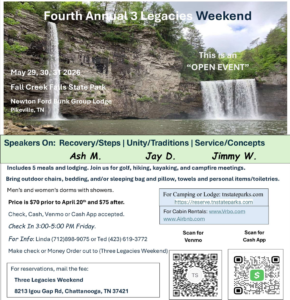 Open recovery weekend focused on the Three Legacies—Recovery, Unity, and Service—featuring speaker meetings, fellowship, lodging, and meals at Fall Creek Falls State Park.