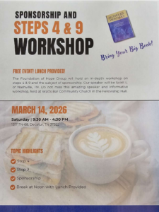 Free recovery workshop on Steps 4 & 9 and sponsorship, with speaker Scott L. Lunch provided. Open to all.