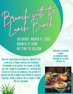Brunch at 10 AM followed by an A.A. meeting at 11 AM. Bring a dish if able. All welcome.