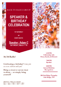 Monthly open AA speaker meeting with pizza, fellowship, a guest speaker, and sobriety birthday recognition. Held the first Saturday of every month in Oak Ridge.