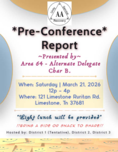 Area 64 will host a Pre-Conference Report presented by the Alternate Delegate, Char B., on Saturday, March 21, 2026, from 12:00–4:00 PM at 121 Limestone Ruritan Rd., Limestone, TN. This