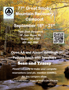 77th Great Smoky Mountain Recovery Campout Join us September 18ā21, 2025 at Triple Creek Campground in Newport, TN for four days of fellowship with open AA and Al-Anon meetings, plus